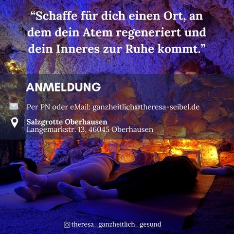 Wenn Sie sich für eine der aufgeführten Veranstaltungen in der Salzgrotte Oberhausen interessieren und sich anmelden möchten können Sie via Email oder Telefon (0208-6947166) Kontakt mit uns aufnehmen. Alternativ ist natürlich auch eine Buchung direkt bei Frau Riesener möglich. Sie bekommen per Mail eine Teilnahmebestätigung in der Woche vor der Veranstaltung – sollte diese nicht ankommen, fragen Sie bitte nach!